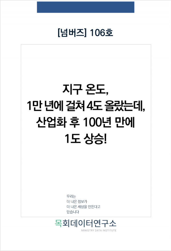 목회데이터연구소 주간리포트 <넘버즈> 제 106호에서는 현재의 기후 위기가 얼마나 심각한 상황인지 짚어보고자 한다. 하나님이 창조하신 자연을 잘 보존하는 것도 인간의 의무임을 되새기며, 건강한 지구를 위해 작은 것이라도 실천하는 계기가 되길 바란다.