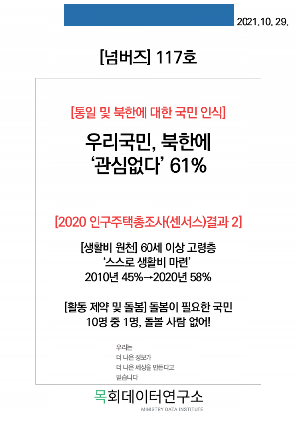 목회데이터연구소 주간리포트 <넘버스> 117호에서는 통일 및 북한에 대한 국민들의 인식을 살펴 보고자 한다. 이 인식을 통해 선교의 대상지로 북한을 바라보는 교회에 도움이 되길 바란다.