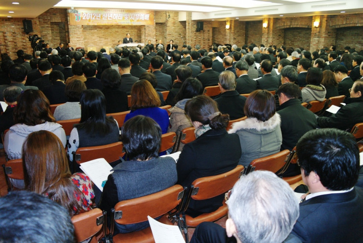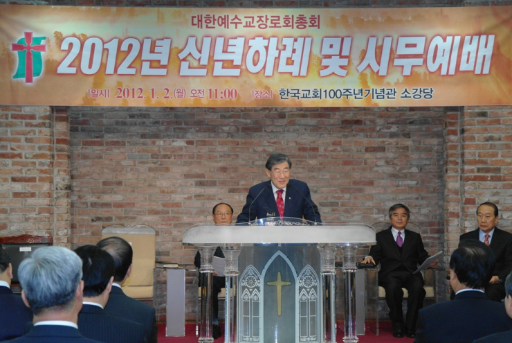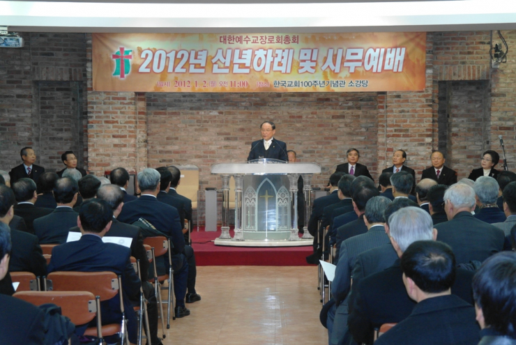 총회 시무예배와 신년하례회가 1월2일(월) 오전 11시 한국교회100주년기념관 소강당에서 교계 내외빈 및 총회 산하 전국노회장, 상임부서 및 위원장, 특별위원장, 산하단체장 및 기관장, 직원 등 200여명이 참석한 가운데 열렸다.