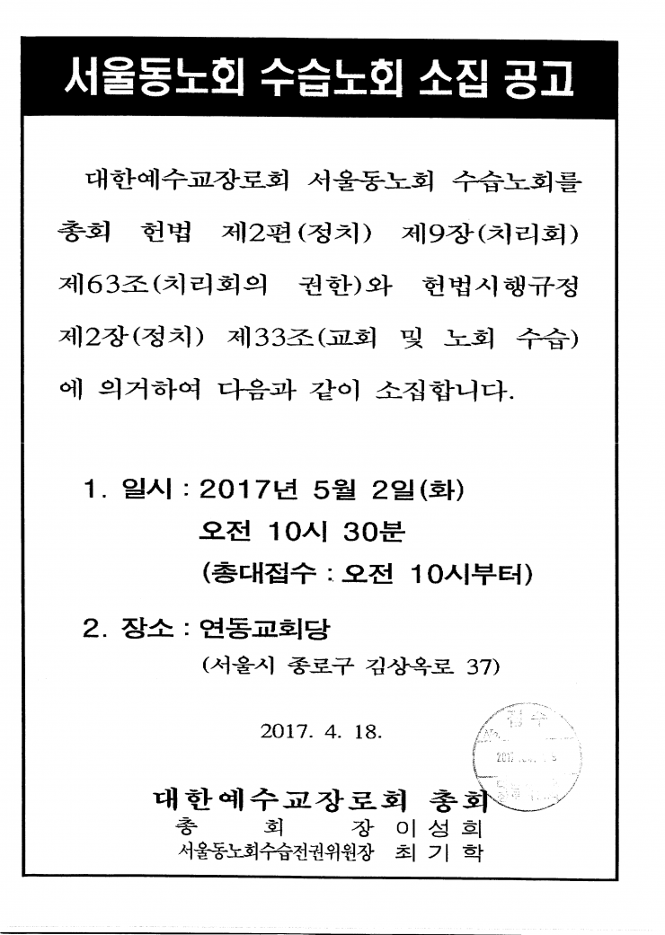 서울동노회 수습노회 소집 공고