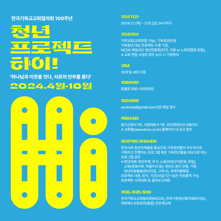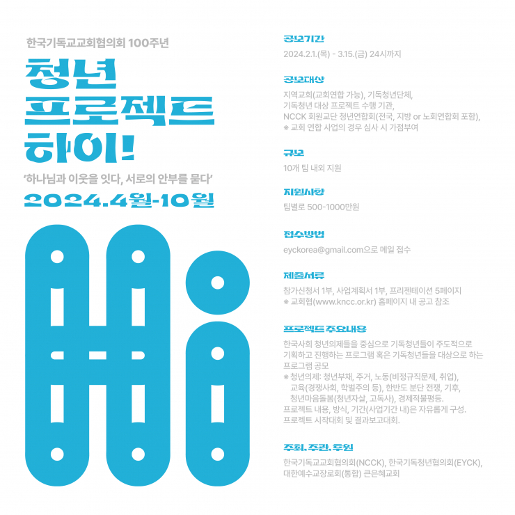 *이 름 : 한국기독교교회협의회 100주년 청년프로젝트 "하이!" *공모대상 : 기독청년단체, 기독청년 대상 프로젝트 수행 기관, NCCK 회원교단 청년연합회, 지교회 *공모기간 : 2024년 2월 1일~3월 15일 *사업기간 : 2024년 4월~10월 *지원사항 : 팀별로 500~1000만원 *주 최 : 한국기독교교회협의회 *주 관 : 한국기독청년협의회 *후 원 : 대한예수교장로회(통합) 큰은혜교회 *문 의 : 한국기독교교회협의회 02-742-8981 press@kncc.or.kr 한국기독청년협의회 02-742-3746 eyck@hanmail.net