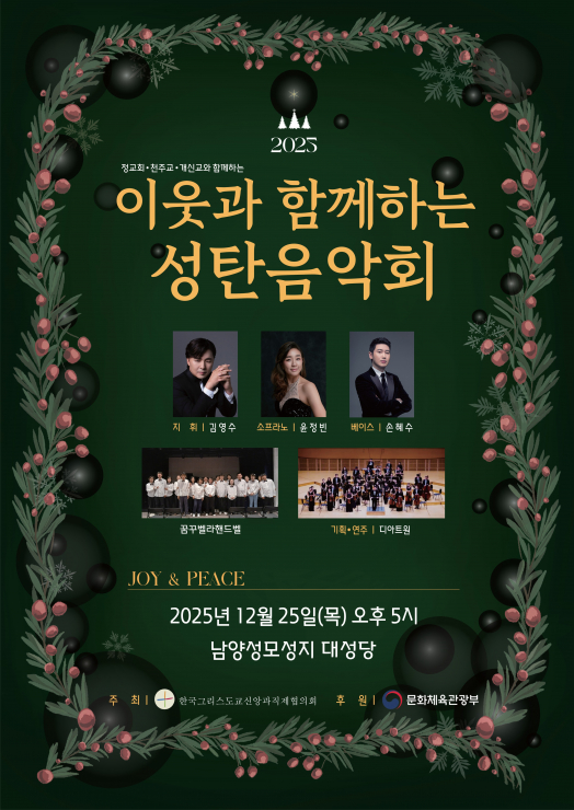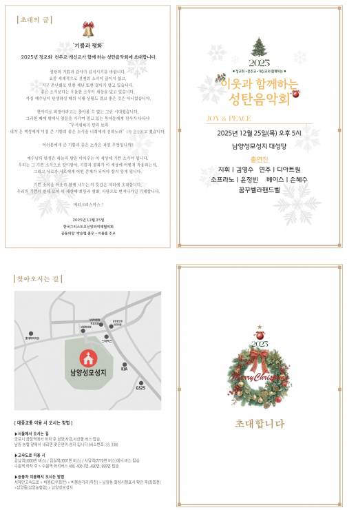 2025년 정교회‧천주교‧개신교가 함께하는 ‘2025 이웃과 함께하는 성탄음악회’에 초대합니다. ‘2025 이웃과 함께하는 성탄음악회’는 성탄의 의미를 되새기며 평화와 연대의 메시지를 문화‧예술의 언어로 나누고자 마련된 행사입니다. 아래 내용와 같이 개최되는 음악회에 관심 있는 분들의 많은 참여를 바랍니다.