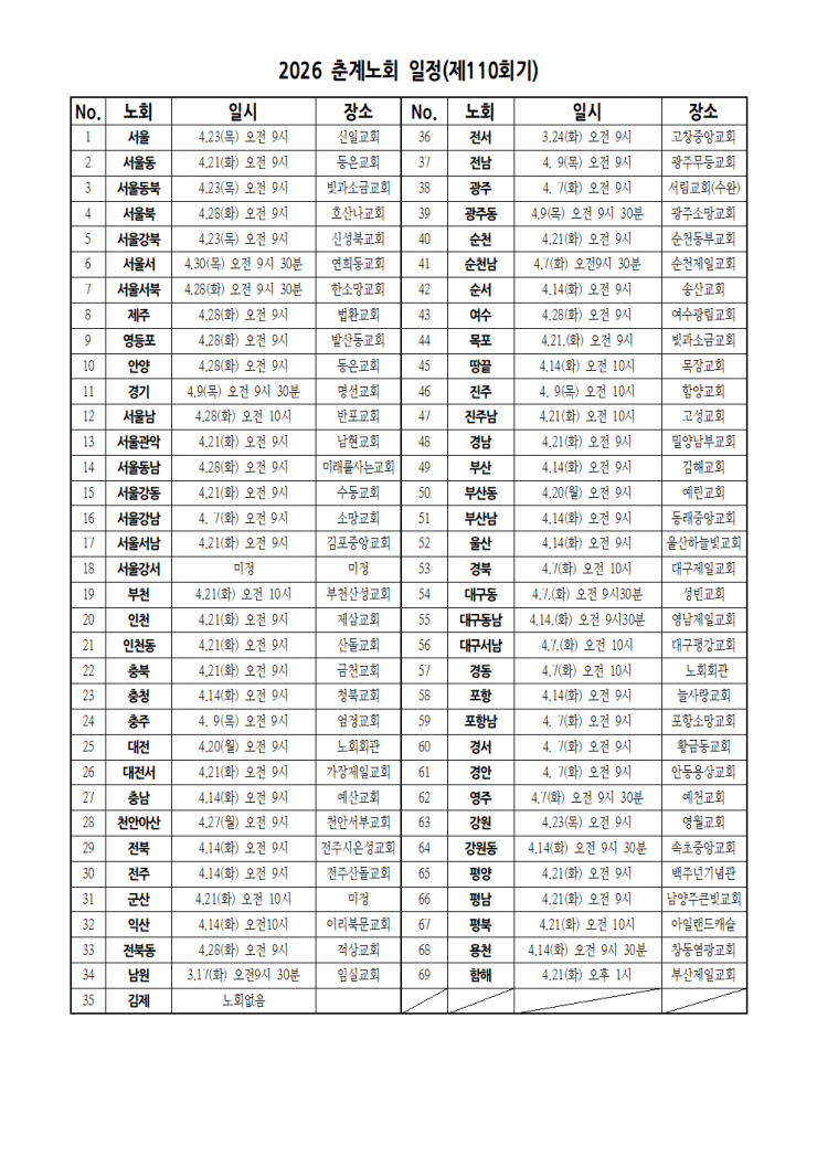 2026 봄노회 일정(제110회기)