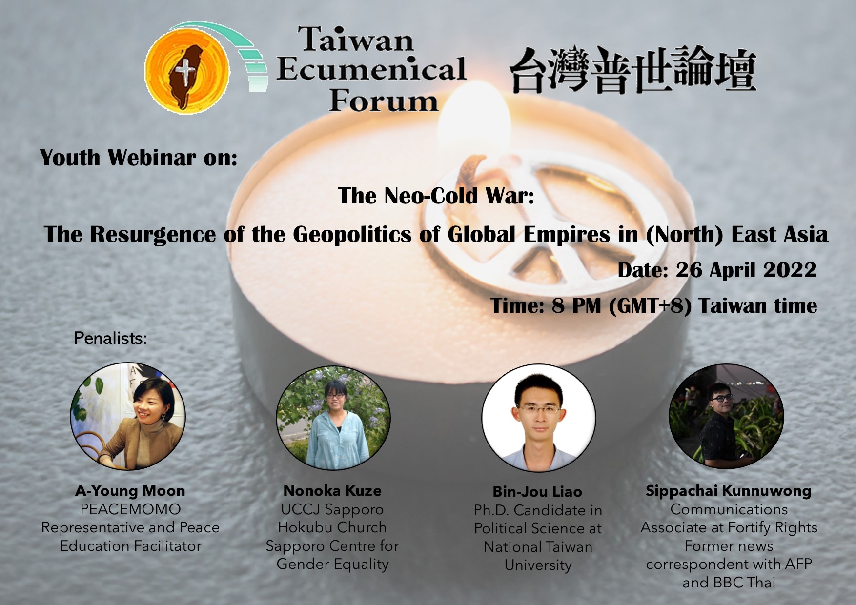 ![]() 대만에큐메니칼포럼(TEF) 주최 청년 웨비나 안내 대만에큐메니칼포럼이 주최하고 세계선교협의회(CWM) 총무 금주섭 목사님과 세계개혁교회커뮤니온(WCRC) 직전 총무 크리스 퍼거슨 목사님이 공동 의장으로 주관하는 청년 웨비나에 관심 있는 청년들을 초청합니다. 1. 일시: 2022년 4월 26일(화) 오후 9시~11시 (한국시간) 2. 주제: 신냉전: 동(북)아시아에서 세계 제국의 지정학적 재등장 3. 장소: 온라인 줌 (줌 주소는 참가신청자들에게 4월 25일에 공지) 4. 참가대상: 동북아 5. 참가신청: 아래의 링크를 통해 신청 https://forms.gle/uSgkTYoM9bYxfbZC6 6. 일정