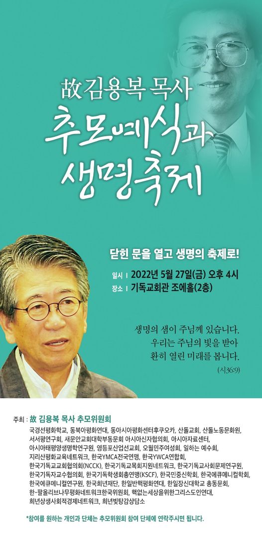 ‘故 김용복 목사 추모예식과 생명축제’ ◾ 일시 : 2022년 5월 27일 (금) 16:00 ◾ 장소 : 한국기독교회관 2층 조에홀, 유튜브 생중계 (+해외 인사 줌 참여) ◾ 주제 : 닫힌 문을 열고 생명의 축제로! (시36:9)