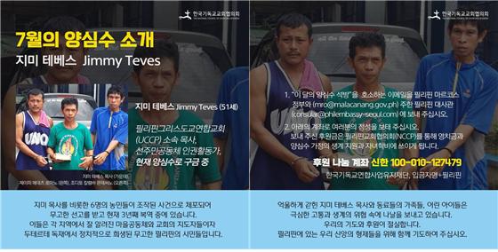 한국기독교교회협의회(NCCK)는 지난 6월부터 필리핀 양심수 석방운동과 후원활동을 시작했습니다. 현재 필리핀에서는 극심한 인권유린과 국가폭력으로 인해 민주사회에서 마땅히 보장되어야 할 기본 권리들이 심각하게 위협받고 있습니다. 또한 공공연히 자행되는 불법체포와 구금, 심지어 정치적 살인으로 인해 희생된 양심수들이 약 800 여명에 이르고 있습니다. 매달 소개드리는 '이달의 양심수와 가족'을 위해 기도해 주시고, 아래와 같이 연대와 후원에 동참해 주시면 감사하겠습니다.