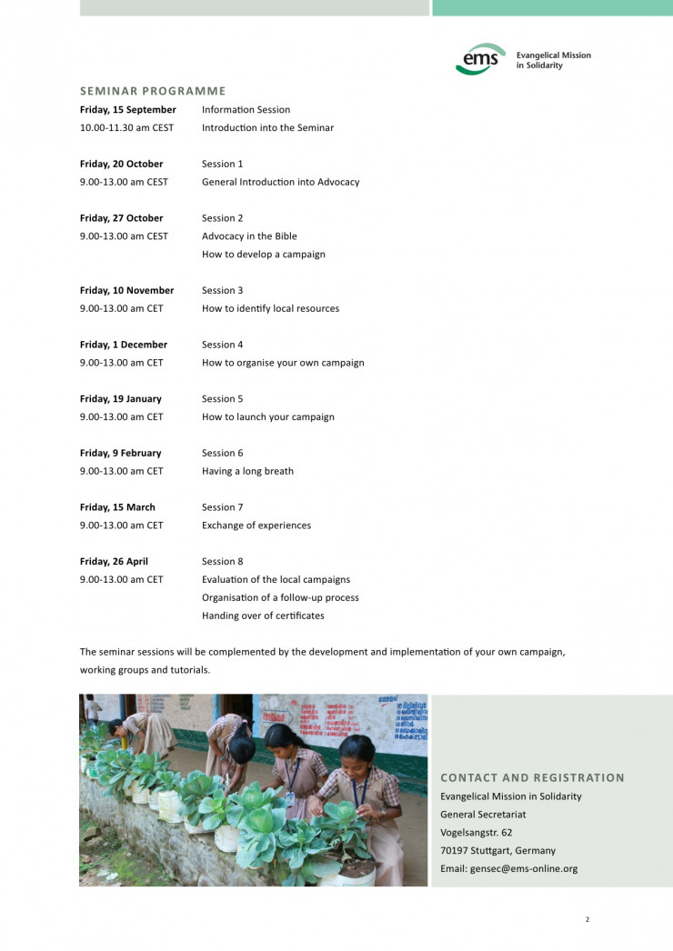 기독교선교연대(EMS)에서는 2023년 10월 20일부터 2024년 4월 26일까지 생태 문제 옹호에 관한 온라인 역량 강화 세미나를 제공합니다. 세미나는 옹호 활동에 대한 기본 지식을 제공합니다. 이 세미나에서는 환경 문제 이슈를 집단적으로 옹호하기 위해 자신이 속한 지역사회의 자원을 사용하는 방법을 가르칠 것입니다. 세미나는 "행동을 통한 학습(Learning by Doing)" 개념을 제공합니다. 세미나 일정 중에 참여 단위가 자체적으로 옹호 캠페인을 개발하고 실행합니다. 자세한 내용은 첨부한 팸플릿을 참조하시기 바랍니다.