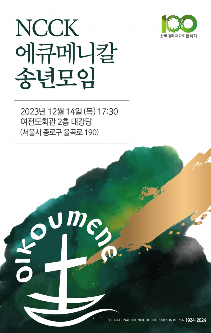 2023 NCCK 에큐메니칼 송년모임 - 일시 : 2023년 12월 14일(목) 오후 5시 30분 - 장소 : 여전도회관 2층 대강당 (서울시 종로구 율곡로 190) - 내용 : 1부 다가섬과 어울림 / 2부 공동식사와 교제 - 초청인 : 한국기독교교회협의회(NCCK) 윤창섭 회장, 김종생 총무 72회기 신임원회 일동
