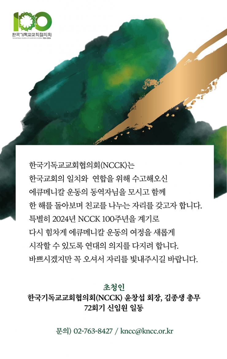 특별히 2024년 NCCK 100주년을 계기로 다시 힘차게 에큐메니칼 운동의 여정을 새롭게 시작할 수 있도록 연대의 의지를 다지려 합니다.