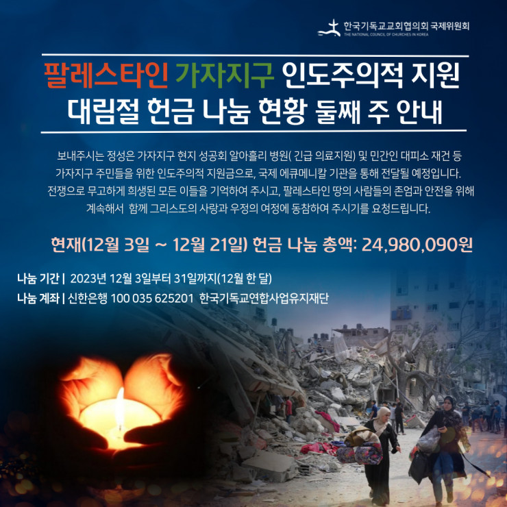 [NCCK] 팔레스타인 가자지구 인도주의적 지원 대림절 헌금 안내[NCCK] 팔레스타인 가자지구 인도주의적 지원 대림절 헌금 나눔