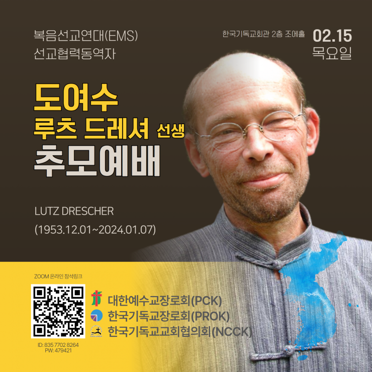 * 루츠 드레셔(도여수) 선생 복음선교연대(EMS) 선교협력동역자(1987-1994) 전 동아시아 국장(2001-2016) 독일동아시아선교회(DOAM) 명예의장(2017-2020) 도여수 선생의 생과 삶의 업적을 기리며, EMS 한국측 파트너 교단인 대한예수교장로회(PCK), 한국기독교장로회(PROK)는 한국기독교교회협의회(NCCK)와 함께 도여수 선생 공동 추모예배를 드릴 예정입니다. 많은 참여를 바랍니다.