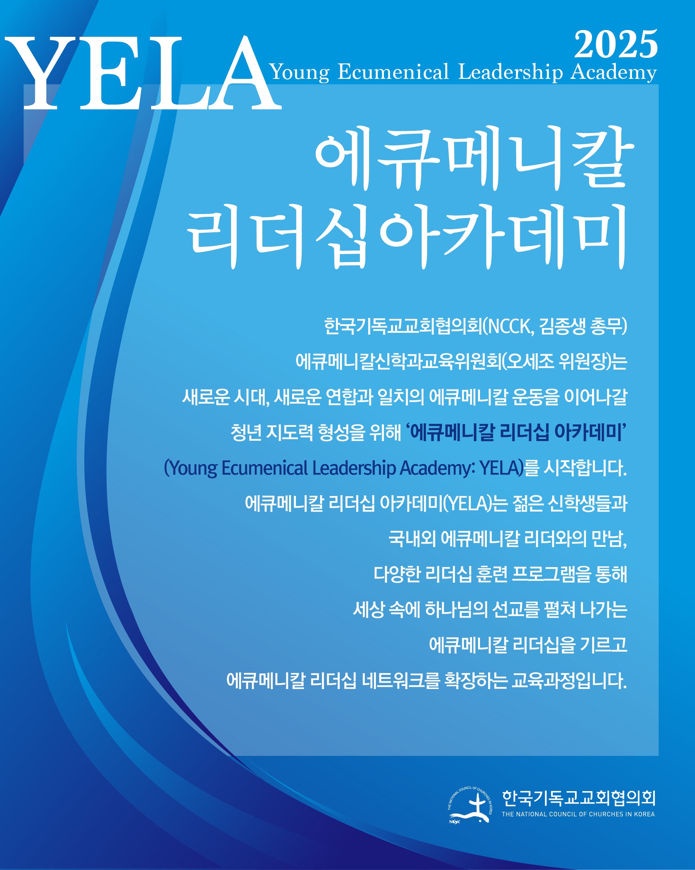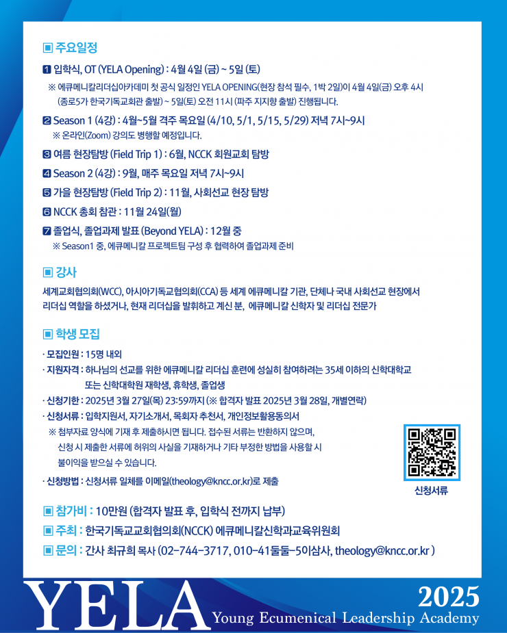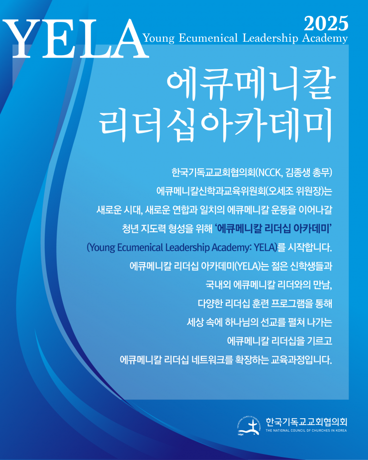 한국기독교교회협의회(NCCK, 김종생 총무) 에큐메니칼신학과교육위원회(오세조 위원장)는 새로운 시대, 새로운 연합과 일치의 에큐메니칼 운동을 이어나갈 청년 지도력 형성을 위해 ‘2025 에큐메니칼 리더십 아카데미(Young Ecumenical Leadership Academy: YELA)를 시작합니다.