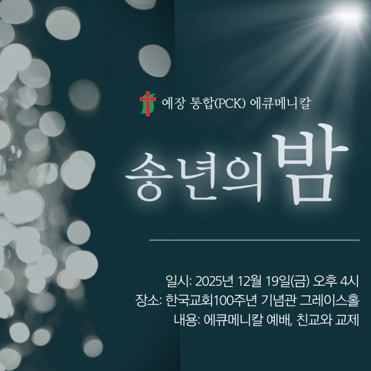 2025년 에큐메니칼 송년의 밤[2025년 예장 에큐메니칼 송년의 밤] 한 해 동안 하나님께서 베풀어 주신 은총과, 교회와 세상을 향한 작은 걸음들을 돌아보며 감사를 나누는 에큐메니칼 송년의 밤에 귀하를 정중히 초대합니다. 올해 우리는, 서로 다른 상황속에서 밝게 빛나는 지혜와 용기를 나누며, 정의와 평화, 그리고 생명을 향한 길을 변함없이 걸어왔습니다. 세상 곳곳에서 들려오는 신음과 희망 사이에서 교회가 무엇을 말해야 하고, 어떻게 살아야 하는지, 서로의 얼굴을 바라보며 배우고 책임을 확인했습니다. 에큐메니칼 송년의 밤은 그 여정 위에서 맺힌 감사의 열매를 함께 붙들고, 다가오는 새해를 향한 공동의 소망을 밝히는 자리입니다. 교회와 지역, 배경을 넘어 한 분 하나님 안에서 자매요 형제로 부름받은 우리가 서로의 빛이 되고 서로의 기도가 되는 시간을 마련하였습니다. 부디 참석하시어 깊은 친교, 서로를 향한 환대와 축복, 그리고 생명을 위한 우리의 연대가 더욱 단단해지길 소망합니다.