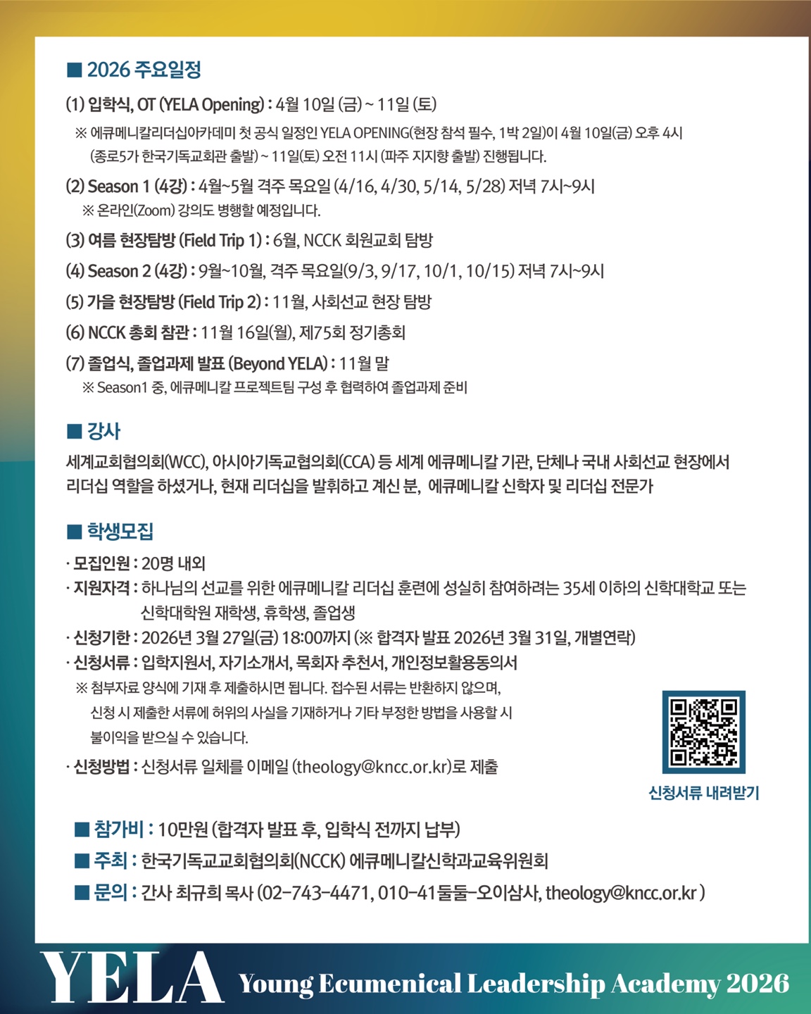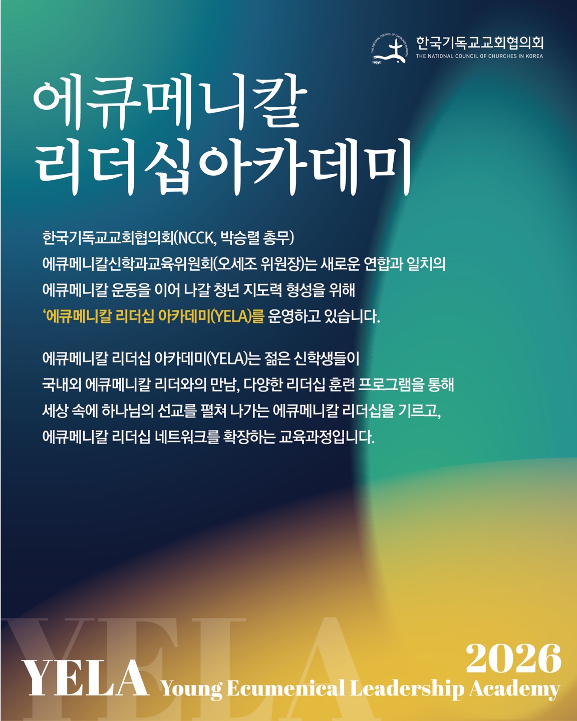 한국기독교교회협의회(NCCK, 총무 박승렬 목사) 에큐메니칼신학과교육위원회(위원장 오세조)는 교회와 사회 속에서 생명·정의·평화의 가치를 함께 실천할 지도력을 기르기 위해 ‘2026년 에큐메니칼 리더십 아카데미(Young Ecumenical Leadership Academy, YELA)’ 2기 참가자를 모집합니다.