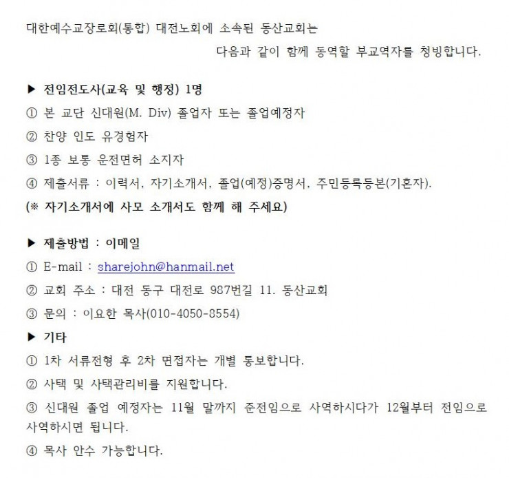 동산교회에서 전임 전도사님을 모십니다.