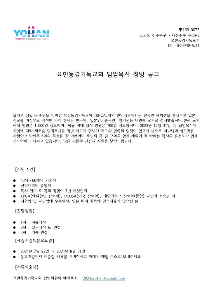 요한 동경 교회에서 담임 목사님을 청빙합니다.