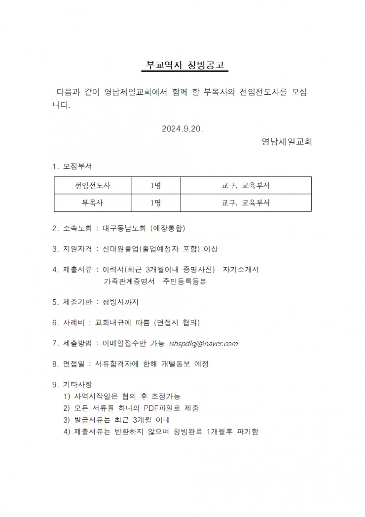 대구 영남제일교회 부교역자 청빙