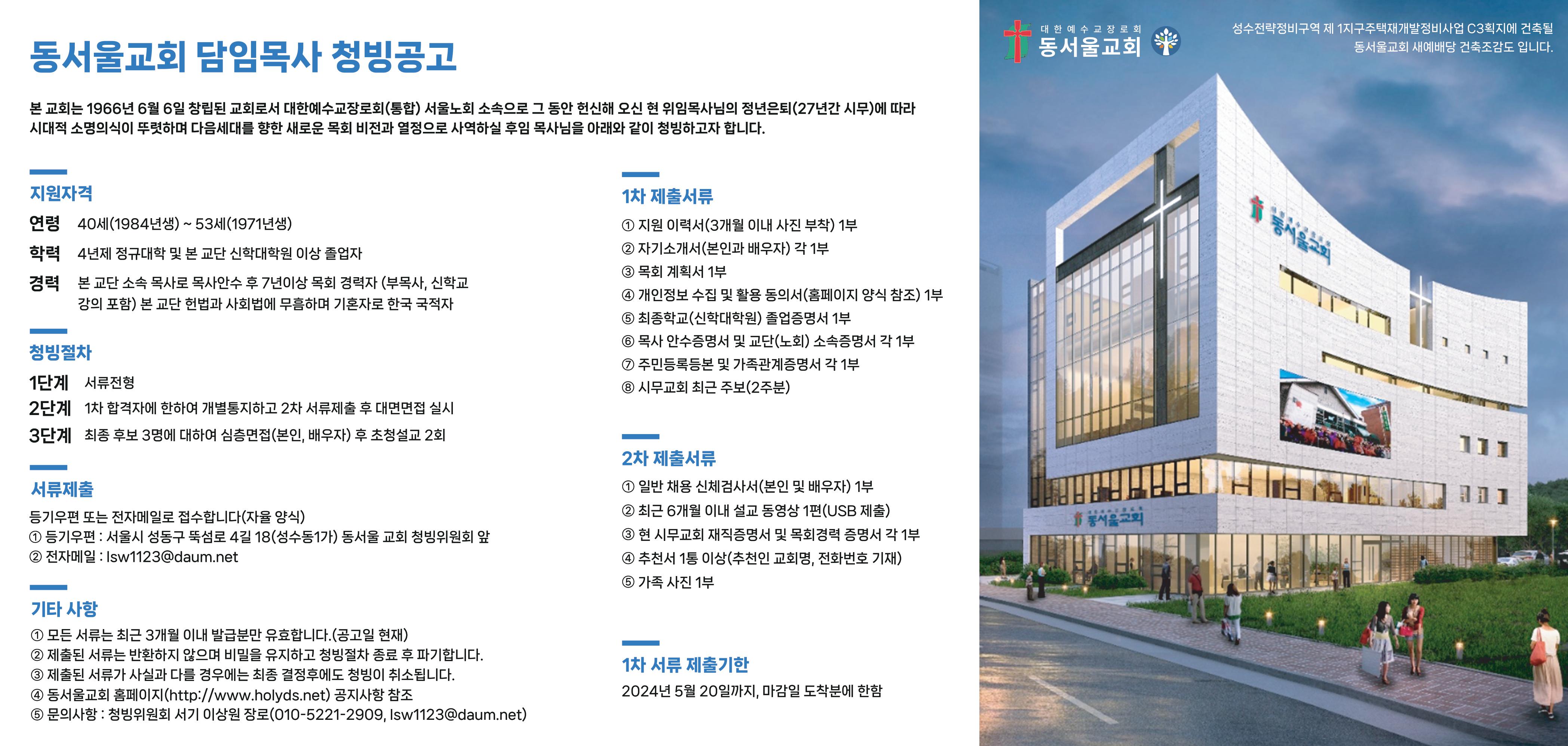 동서울교회(서울노회) 담임목사 청빙 공고![]() 동서울교회 담임목사 청빙 공고 본 교회는 1966년 6월 6일 창립된 교회로서 대한예수교장로회(통합) 서울노회 소속으로 그 동안 헌신해 오신 현 위임목사님의 정년은퇴(27년간 시무)에 따라 시대적 소명의식이 뚜렷하며 다음세대를 향한 새로운 목회 비전과 열정으로 사역하실 후임 목사님을 아래와 같이 청빙하고자 합니다. 1. 지원자격 ① 연령 : 40세(1984년생) ~ 53세(1971년생) ② 학력 : 4년제 정규대학 및 본 교단 신학대학원 이상 졸업자 ③ 경력 : 본 교단 소속 목사로 목사안수 후 7년이상 목회 경력자 (부목사, 신학교 강의 포함) 본 교단 헌법과 사회법에 무흠하며 기혼자로 한국 국적자 2. 전형절차 ① 1단계 - 서류전형 ② 2단계 – 1차 합격자에 한하여 개별통지하고 2차 서류제출 후 대면면접 실시 ③ 3단계 - 최종 후보 3명에 대하여 심층면접(본인, 배우자) 후 초청설교 2회 3. 서류제출 등기우편 또는 전자메일로 접수합니다. (자율양식) ① 등기우편 : 서울시 성동구 뚝섬로 4길 18(성수동1가) 동서울교회 청빙위원회 앞 ② 전자메일 : "> (작성 후 pdf 파일로 변환하여 이메일로 접수) 4. 1차 제출서류 ① 지원 이력서(3개월 이내 사진 부착) 1부 ② 자기소개서(본인과 배우자) 각 1부 ③ 목회계획서 1부 ④ 개인정보 수집 및 활용 동의서(홈페이지 양식 참조) 1부 ⑤ 최종학교(신학대학원) 졸업증명서 1부 ⑥ 목사안수증명서 및 교단(노회) 소속증명서 각 1부 ⑦ 주민등록등본 및 가족관계증명서 각 1부 ⑧ 시무교회 최근 주보(2주분) 5. 2차 제출서류 ① 일반 채용 신체검사서(본인 및 배우자) 1부 ② 최근 6개월 이내 설교 동영상 1편(USB 제출) ③ 현 시무교회 재직증명서 및 목회경력 증명서 각 1부 ④ 추천서 1통 이상(추천인 교회명, 전화번호 기재) ⑤ 가족 사진 1부 6. 1차 서류 제출기한 2024년 5월 20일 까지, 마감일 도착분에 한함 7. 기타사항 ① 모든 서류는 최근 3개월 이내 발급분만 유효합니다. (공고일 현재) ② 제출된 서류는 반환하지 않으며 비밀을 유지하고 청빙절차 종료 후 파기합니다. ③ 제출된 서류가 사실과 다를 경우에는 최종 결정 후에도 청빙이 취소됩니다. ④ 동서울교회 홈페이지(http://www.holyds.net) 공지사항 참조 ⑤ 문의사항 : 청빙위원회 서기 이상원 장로(010-5221-2909, ">) 대한예수교장로회 동서울 교회 담임목사 청빙위원회