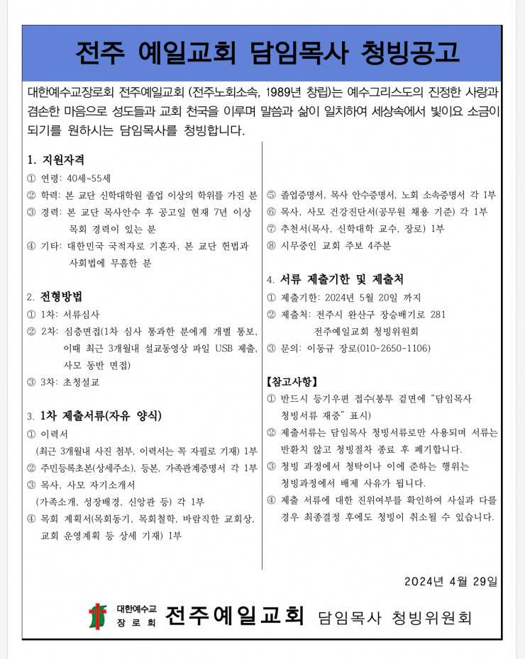 전주 예일교회 담임목사 청빙공고