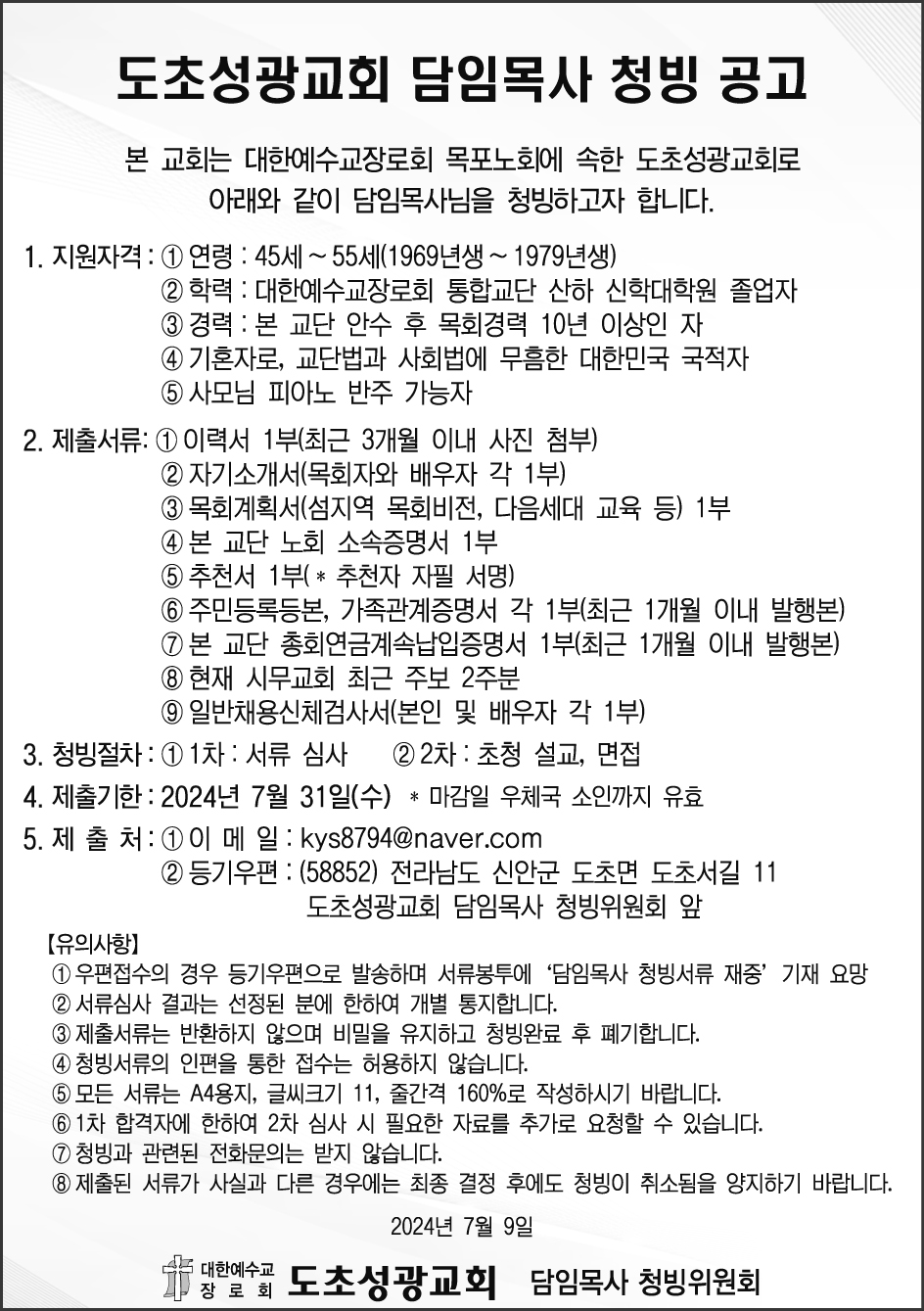 도초성광교회 담임목사 청빙![]() 도초성광교회 담임목사 청빙공고 본 교회는 대한예수교장로회(통합) 목포노회에 속한 도초성광교회로 아래와 같이 담임목사님을 청빙하고자 합니다. 지원자격 ① 연령 : 45세~55세 (1969년생~1979년생) ② 학력 : 대한예수교장로회 통합교단 산하 신학대학원 졸업자 ③ 경력 : 본 교단 안수 후 목회경력 10년 이상인 자 ④ 기혼자로, 교단법과 사회법에 무흠한 대한민국 국적자 ⑤ 사모님 피아노 반주 가능자 2. 제출서류 ① 이력서 1부(최근 3개월 이내 사진 첨부) ② 자기소개서(목회자와 배우자 각 1부) ③ 목회계획서(섬지역 목회비전, 다음세대 교육 등) 1부 ④ 본 교단 노회 소속증명서 1부 ⑤ 추천서 1부(*추천자 자필서명) ⑥ 주민등록등본, 가족관계증명서 각 1부 (최근 1개월 이내 발행본) ⑦ 본 교단 총회연금계속납입증명서 1부 (최근 1개월 이내 발행본) ⑧ 현재 시무교회 최근 주보 2주분 ⑨ 일반채용신체검사서 (본인 및 배우자 각 1부) 3. 청빙절차 ① 1차 : 서류 심사 ② 2차 : 초청 설교, 면접 4. 제출기한 : 2024년 7월 31일(수) *마감일 우체국 소인까지 유효 5. 제출처 ① 이메일 : "> ② 우편: (우)58852 전남 신안군 도초면 도초서길 11 도초성광교회 담임목사 청빙위원회 앞 6. 유의사항 ① 우편접수의 경우 우체국 등기우편으로 발송할 것(서류봉투에 “담임목사 청빙서류 재중” 기재요망) ② 서류심사 결과는 선정된 분에 한하여 개별 통지합니다. ③ 제출서류는 반환하지 않으며 비밀을 유지하고 청빙완료 후 폐기합니다. ④ 청빙서류의 인편을 통한 접수는 허용하지 않습니다. ⑤ 모든 서류는 A4용지, 글씨크기 11, 줄간격 160%로 작성하시기 바랍니다. ⑥ 1차 합격자에 한하여 2차 심사 시 필요한 자료를 추가로 요청할 수 있습니다. ⑦ 청빙과 관련된 전화문의는 받지 않습니다. ⑧ 제출된 서류가 사실과 다른 경우에는 최종 결정 후에도 청빙이 취소됨을 양지하기 바랍니다. 2024년 7월 9일 대한예수교장로회 도초성광교회 담임목사 청빙위원회