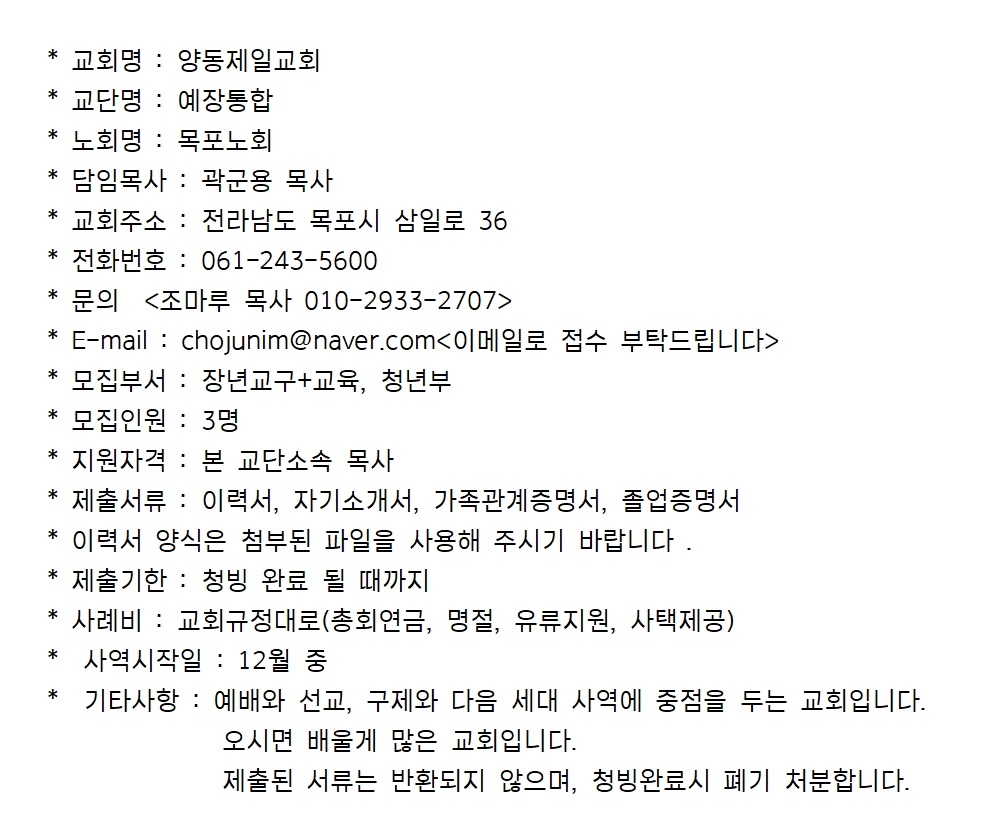 목포 양동제일교회에서 부목사님을 청빙합니다.