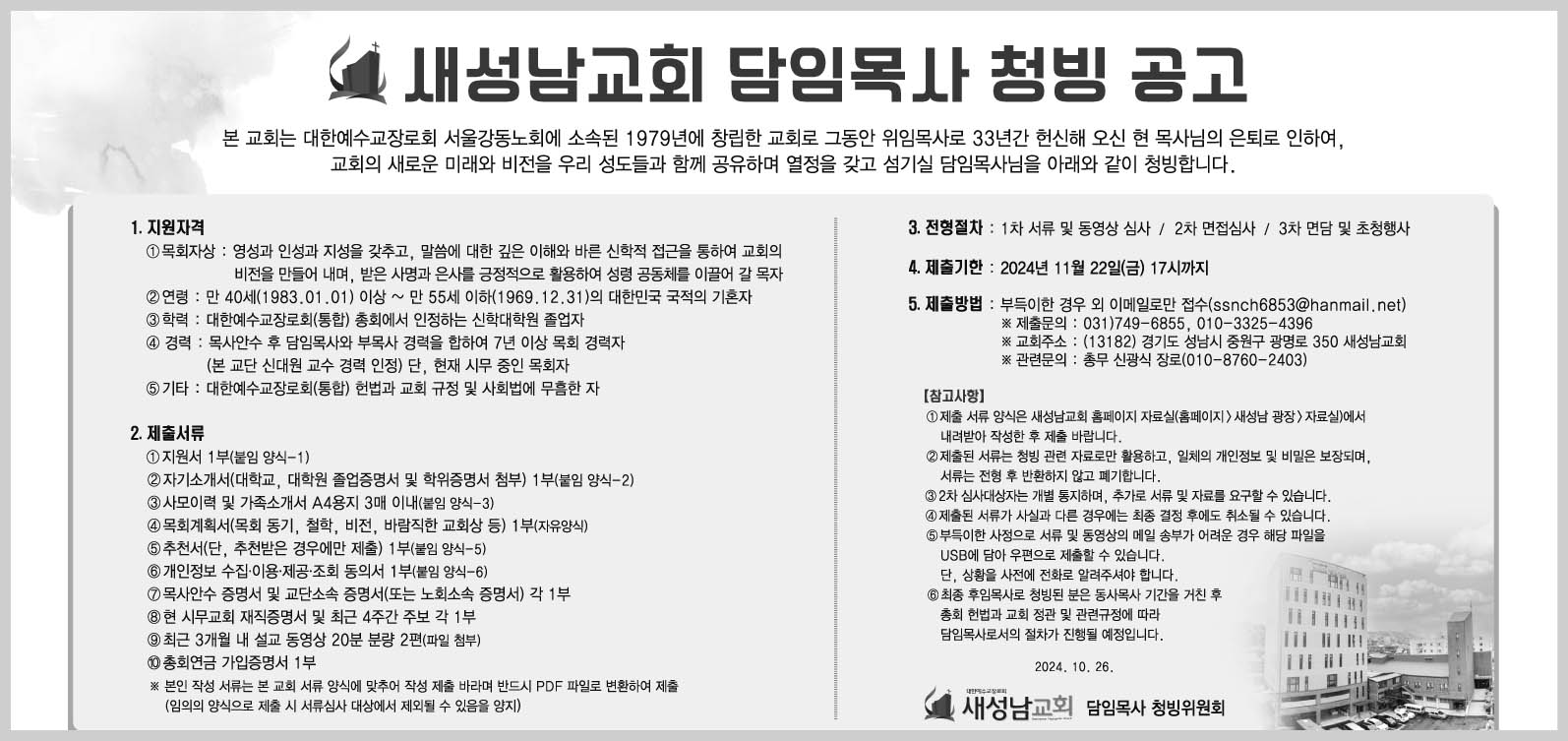 새성남교회 담임목사 청빙 공고