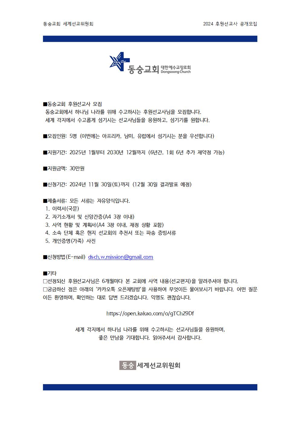 동숭교회에서 후원선교사님을 모집합니다.![]() ■동숭교회 후원선교사 모집 동숭교회에서 하나님 나라를 위해 수고하시는 후원선교사님을 모집합니다. 세계 각지에서 수고롭게 섬기시는 선교사님들을 응원하고, 섬기기를 원합니다. ■모집인원: 5명 (이번에는 아프리카, 남미, 유럽에서 섬기시는 분을 우선합니다) ■지원기간: 2025년 1월부터 2030년 12월까지 (6년간, 1회 6년 추가 재약정 가능) ■지원금액: 매월 30만원 ■신청기간: 2024년 11월 30일(토)까지 (12월 30일 결과발표 예정) ■제출서류: 모든 서류는 자유양식입니다. 1. 이력서(국문) 2. 자기소개서 및 신앙간증(A4 3장 이내) 3. 사역 현황 및 계획서(A4 3장 이내, 재정 상황 포함) 4. 소속 단체 혹은 현지 선교회의 추천서 또는 파송 증빙서류 5. 개인증명(가족) 사진 ■신청방법(E-mail) "> ■기타 □선정되신 후원선교사님은 6개월마다 본 교회에 사역 내용(선교편지)을 알려주셔야 합니다. □궁금하신 점은 아래의 ‘카카오톡 오픈채팅방’을 사용하여 무엇이든 물어보시기 바랍니다. 어떤 질문이든 환영하며, 확인하는 대로 답변 드리겠습니다. 익명도 괜찮습니다. https://open.kakao.com/o/gTChZ9Df 세계 각지에서 하나님 나라를 위해 수고하시는 선교사님들을 응원하며, 좋은 만남을 기대합니다. 읽어주셔서 감사합니다. |