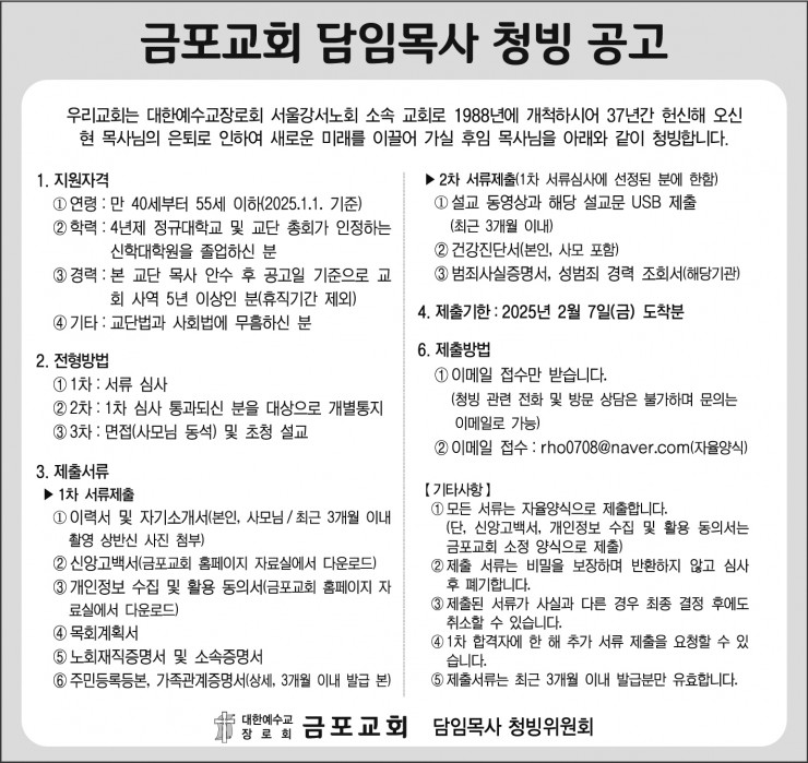 금포교회에서 담임목사님을 청빙합니다.