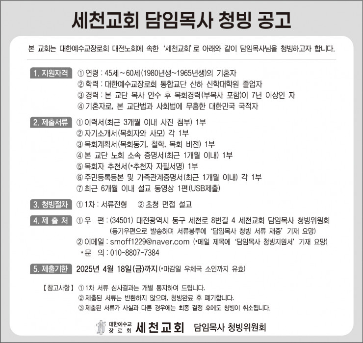 세천교회 담임목사 청빙공고(대전노회)