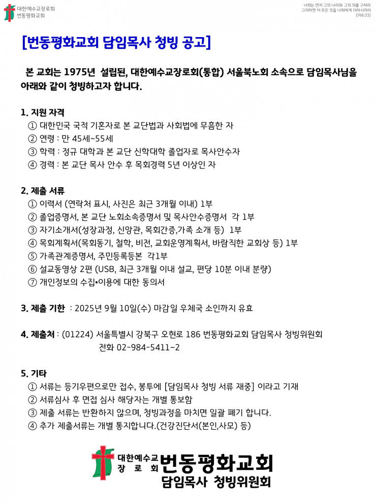번동평화교회 담임목사님를 청빙합니다._청빙완료