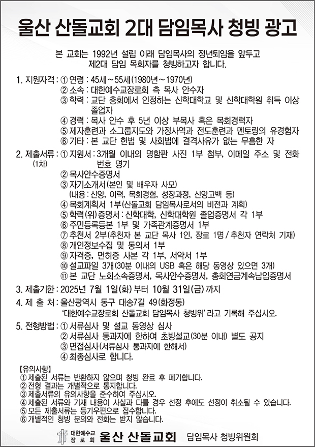 울산산돌교회에서 2대 담임목사를 청빙합니다. 지원하주세요