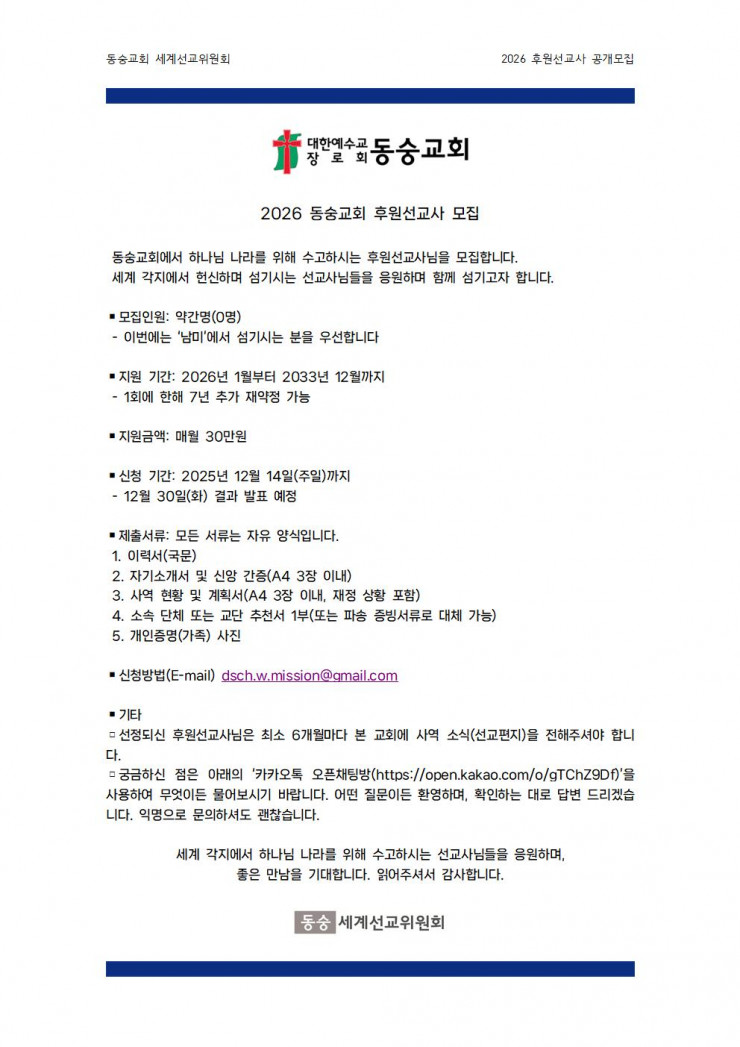 동숭교회 후원선교사 모집