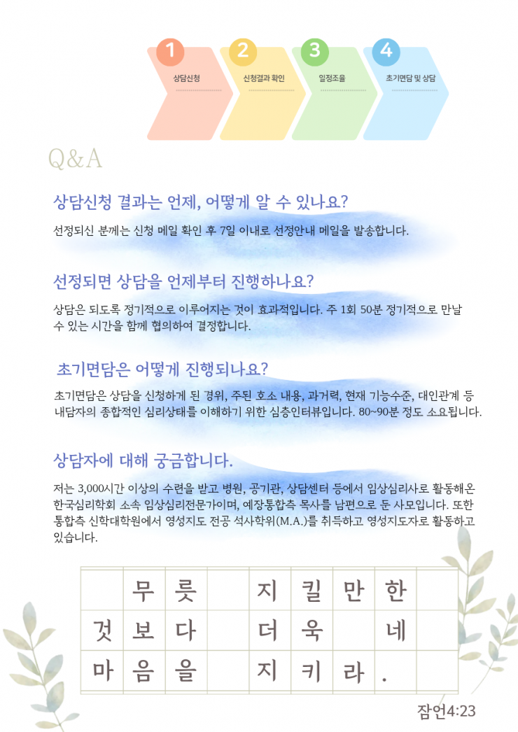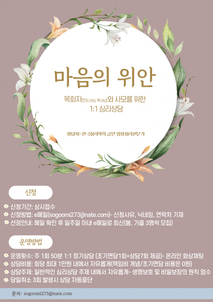 상담이 필요하신 목회자나 사모님 계시면 언제든 신청해 주세요.